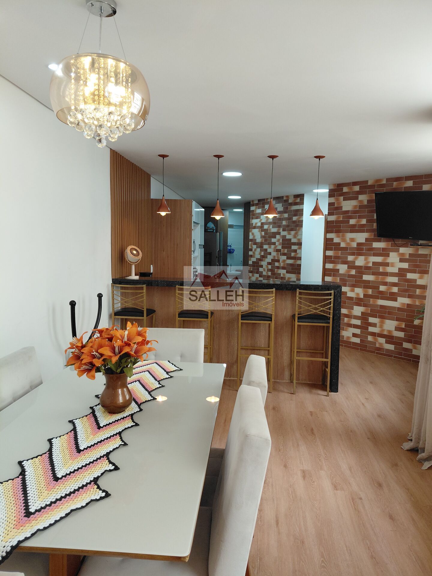 Descrição: Sala de estar, sala de jantar e cozinha americana integradas, a cozinha com armários novos planejados, fogão de indução, instalação para lava-louças, tomadas 110 e 220v, bancadas em granito, 03 quartos (01 dos quartos foi transformado em closet, mas é possível a ampliação transformando-o em quarto para dormir, pois a parede é de drywall), 02 banheiros (sendo 01 suíte, com espaço e instalação hidráulica para banheira de hidromassagem).