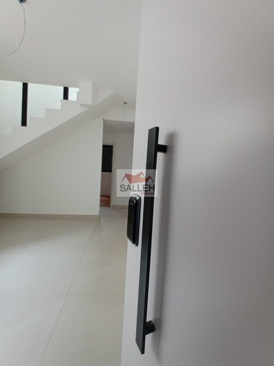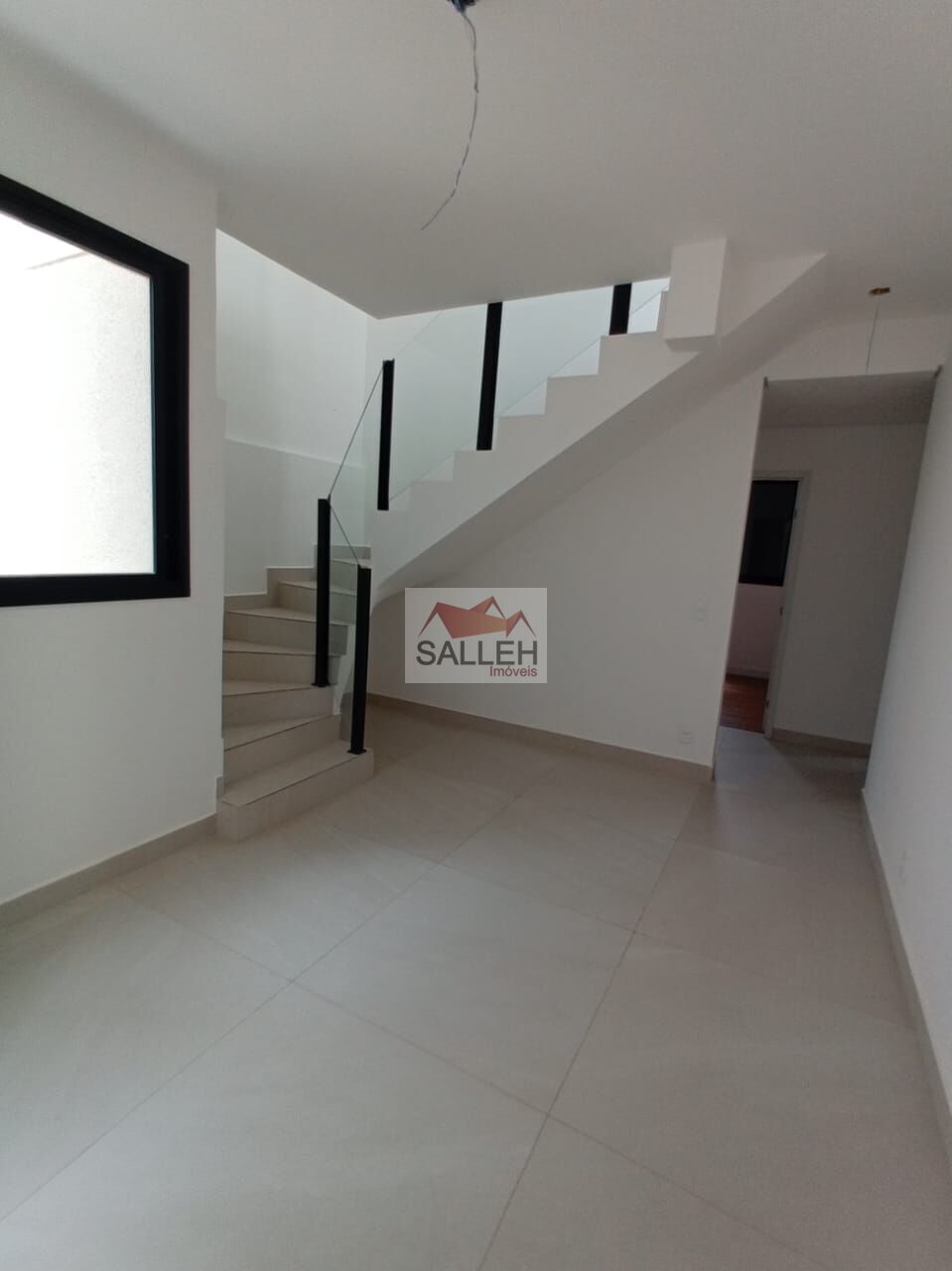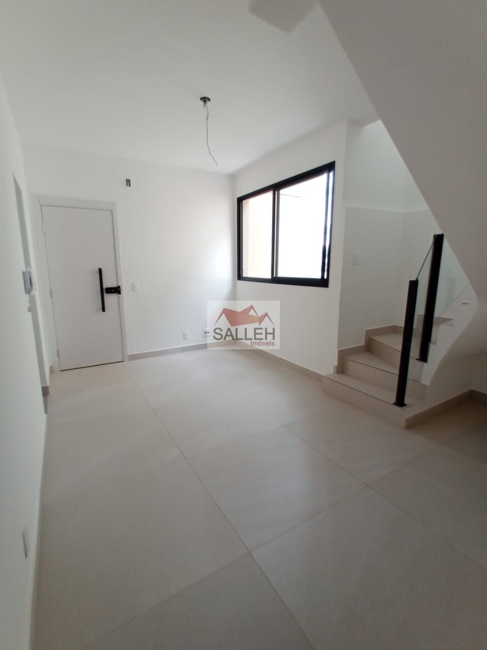 Segundo nível: Sala com piso em porcelanato polido, um banheiro de apoio e área externa, ideal para receber amigos ou aproveitar momentos de descanso.