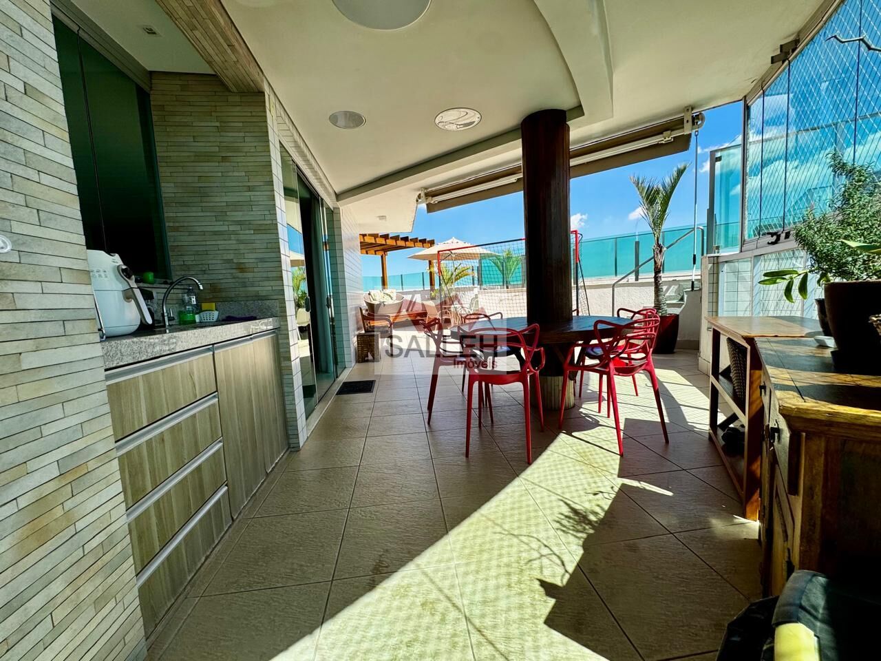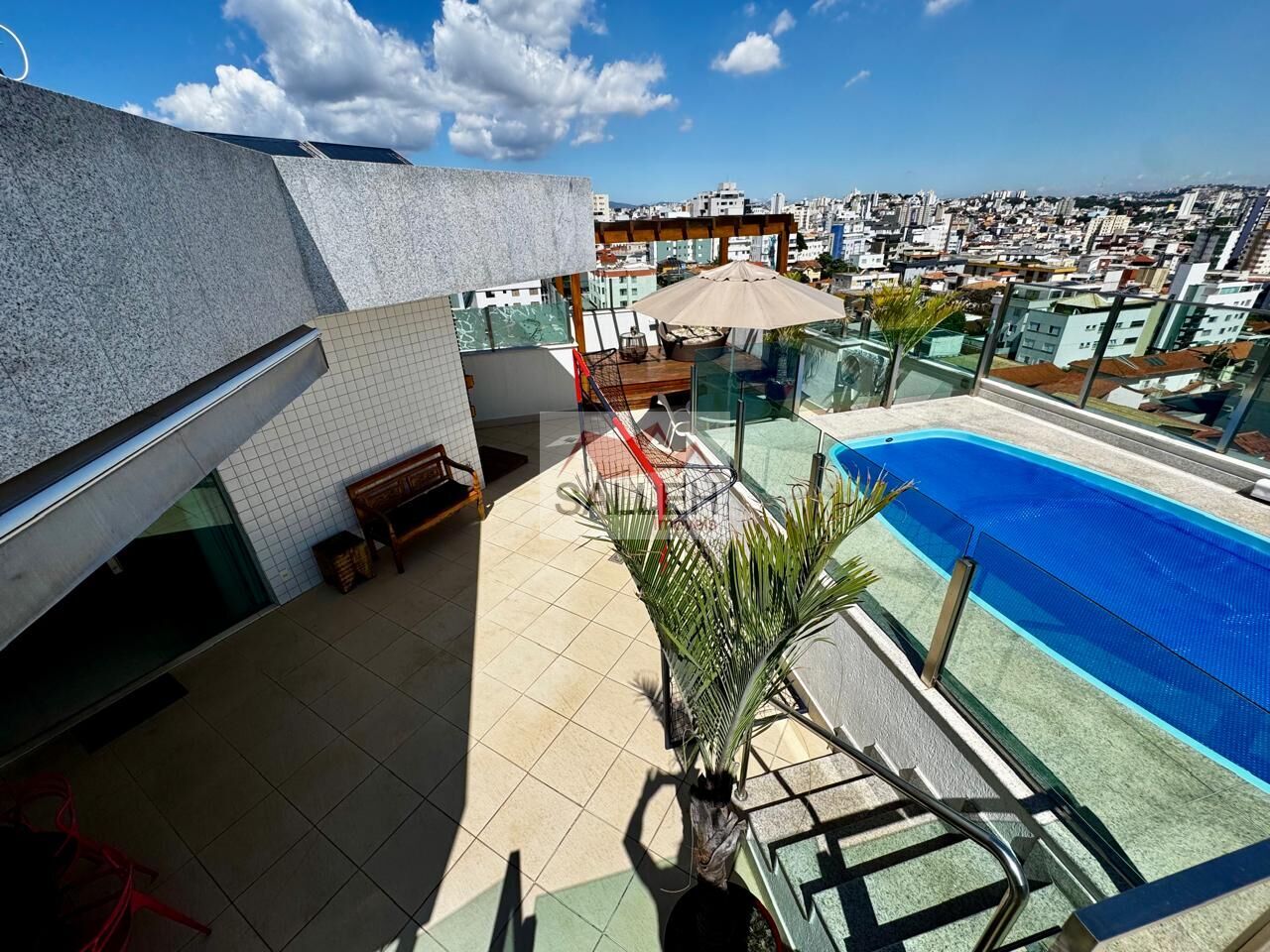 2º PISO: Sendo 01 excelente sala com piso em mármore, com barzinho fixo, painel com rack fixo, rebaixamento em gesso, lavabo, amplo terraço com espaço gourmet, sauna, ducha, piscina, com uma área de convivio maravilhoso sob um pergolado de madeira com uma linda vista definitiva de 270° graus da cidade.