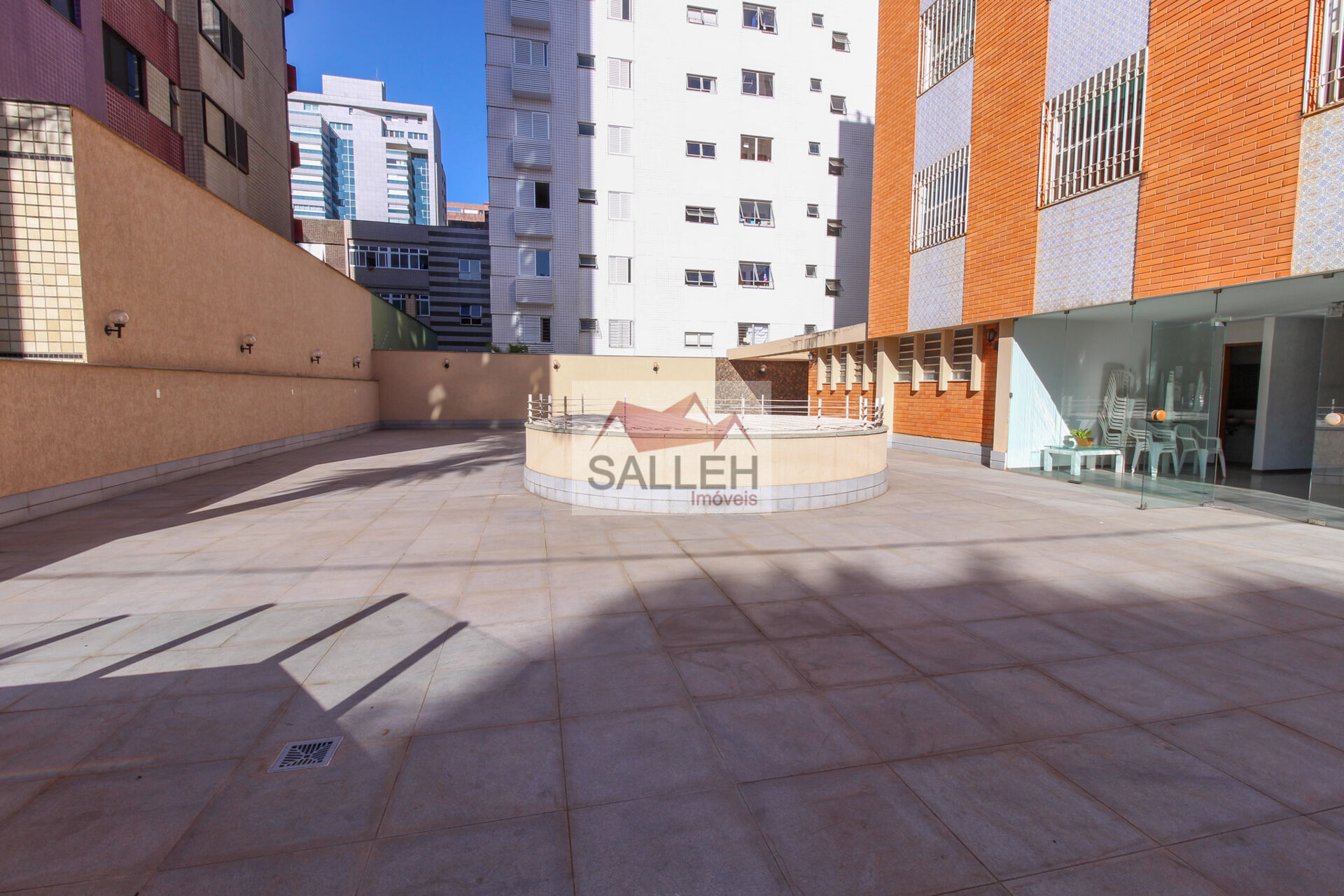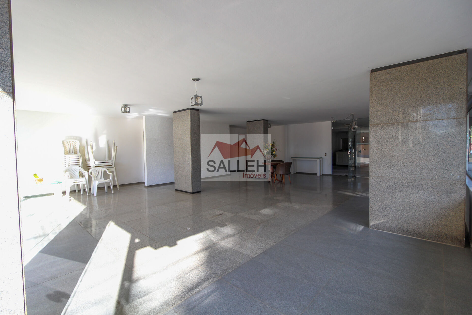 O prédio oferece diversas comodidades, incluindo um salão de festas com dois banheiros e cozinha, quadra poliesportiva, hall de entrada decorado, jardins e um grande pátio externo. A segurança é garantida com porteiro físico das 15h até as 22h, monitoramento por câmeras, interfone, portão eletrônico e alarme. O prédio possui dois elevadores, social e de serviço, e as melhores vagas de garagem, cobertas e demarcadas, em linha para dois carros. Há também um box de despejo disponível.
