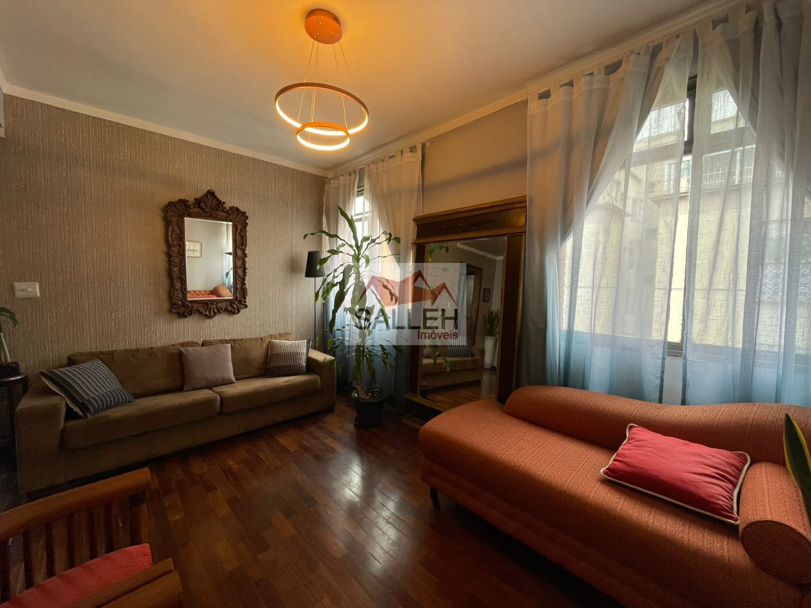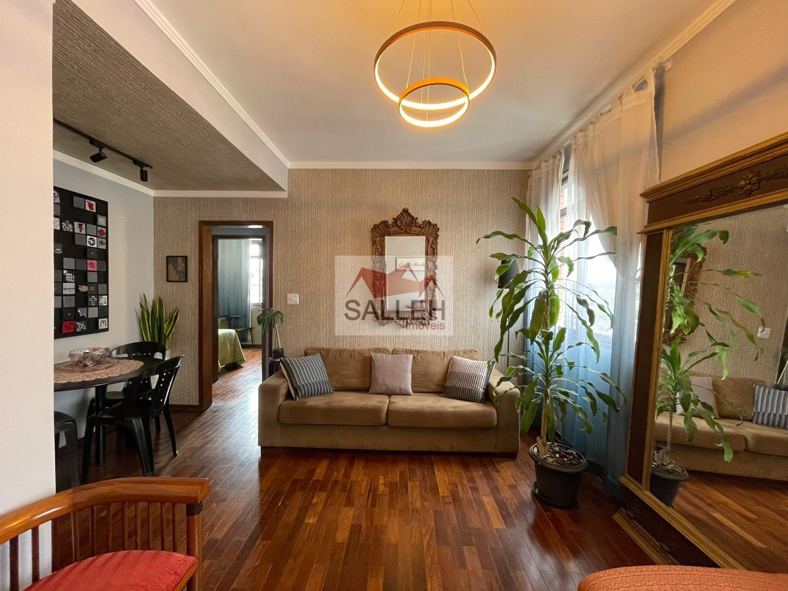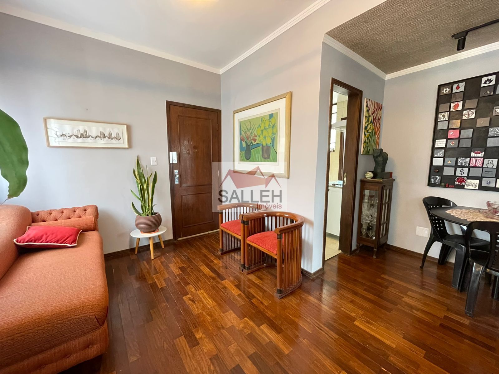 Sala para dois ambientes com piso em taco sintecado, pé-direito elevado com teto em sanca, cozinha funcional, com armários planejados, bancada em inox e piso em porcelanato, 02 quartos amplos, ambos com armários planejados e piso em taco sintetico, banheiro social com piso em porcelanato, bancada em madeira, cuba em louça e box em blindex, área de serviço individual com banheiro de apoio e escritório, ideal para home office.