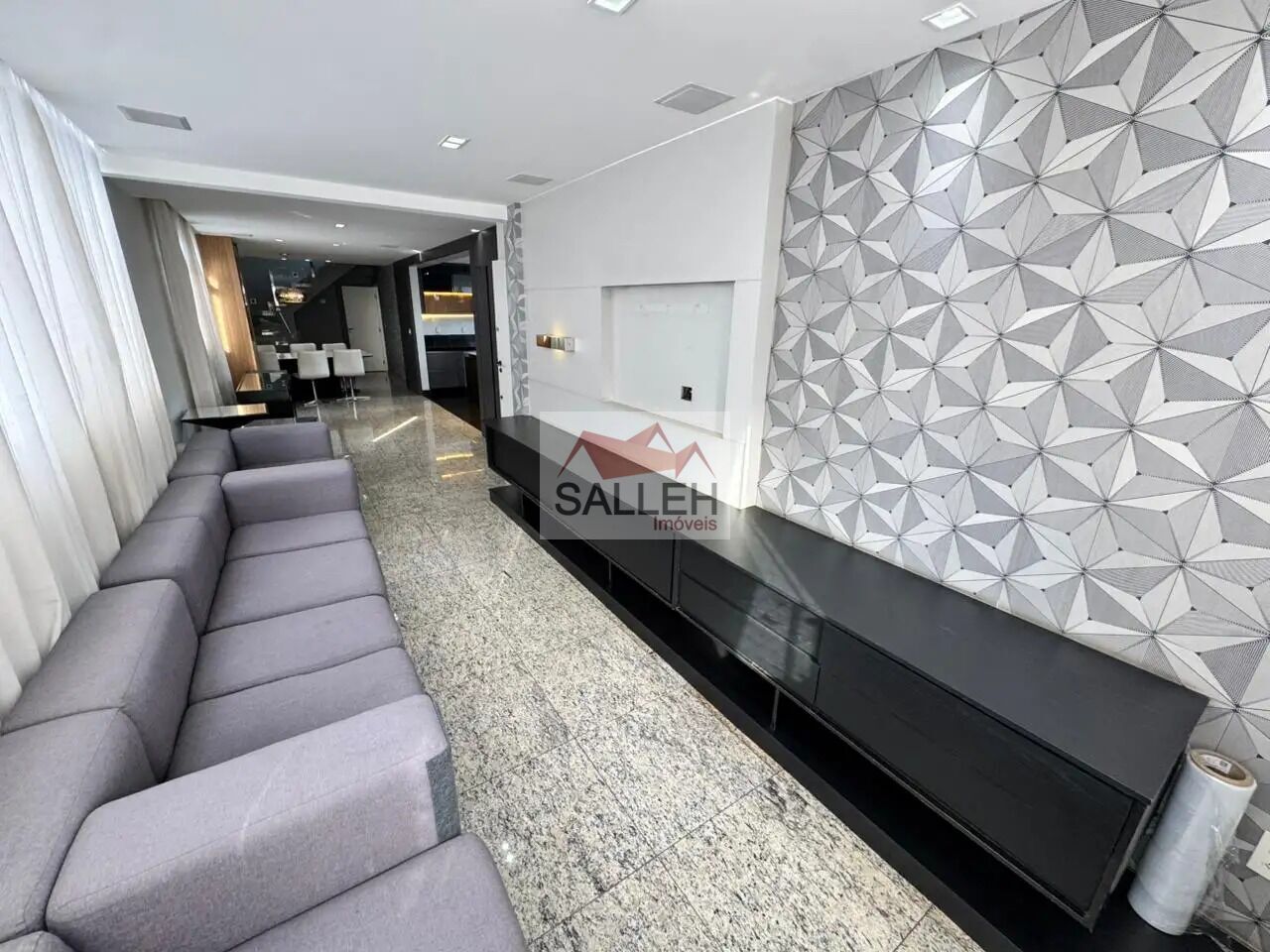 1º Pavimento: Ampla sala para dois ambientes, com rebaixamento em gesso, iluminação planejada, cristaleira e piso em granito, lavabo e rouparia no corredor, banho social com bancada em granito, armário, espelho e box em blindex, 04 quartos amplos com armários planejados e piso vinílico, sendo, 01 suíte máster com hidromassagem e closet (podendo ser revertido em quarto adicional), 01 suíte júnior, banhos das suítes com bancada em granito ou nano glass, armários e box em blindex, cozinha americana com piso e bancada em granito, armários planejados e excelente integração com a sala e área de serviço independente com piso em granito.