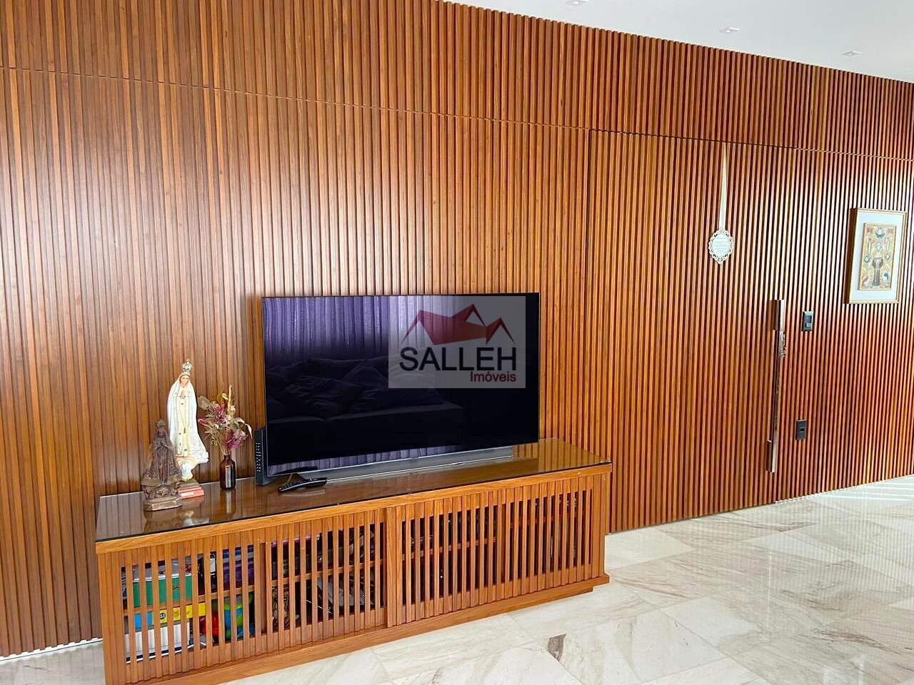 Sala ampla para dois ambientes com piso em mármore e rebaixamento de teto com projeto luminotécnico, varanda aconchegante e lavabo com excelente acabamento, 04 quartos com excelentes armários, sendo 01 suíte máster com ar-condicionado, banheiro social e rouparia no corredor, cozinha americana com ilha toda planejada, cristaleira e armários sob medida e área de serviço funcional com despensa e armários.