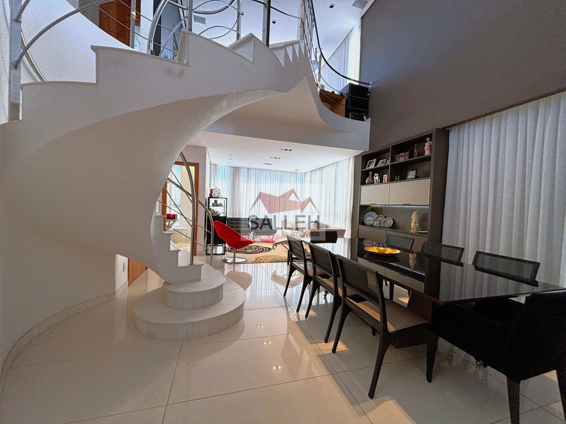 1º Pavimento: ampla sala para três ambientes, com piso em porcelanato, pé-direito duplo e teto rebaixado com projeto de iluminação sofisticada, lavabo elegante, com acabamento de alto padrão, 05 quartos com armários planejados, sendo dois semi-suítes, uma suíte, incluindo uma suíte máster com hidromassagem e iluminação personalizada. Os banheiros possuem bancadas em mármore, armários, box e espelhos. Um dos quartos foi transformado em um escritório, cozinha moderna com armários planejados, piso em porcelanato e bancadas em granito, área de serviço e dependência completa para funcionários (DCE) e escada de acesso ao segundo pavimento, com corrimão em inox.