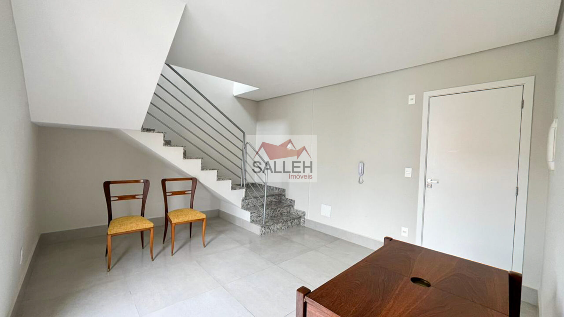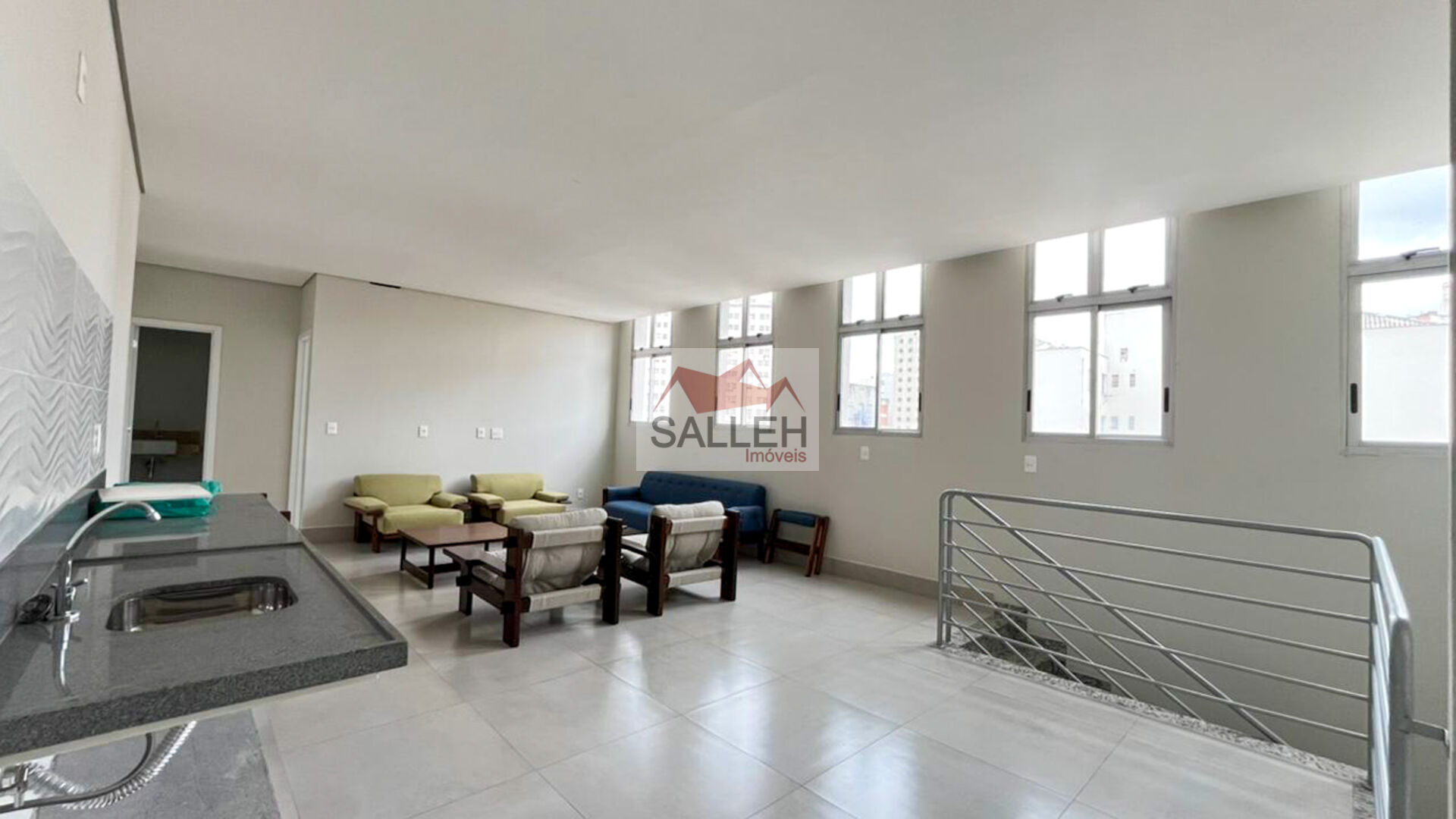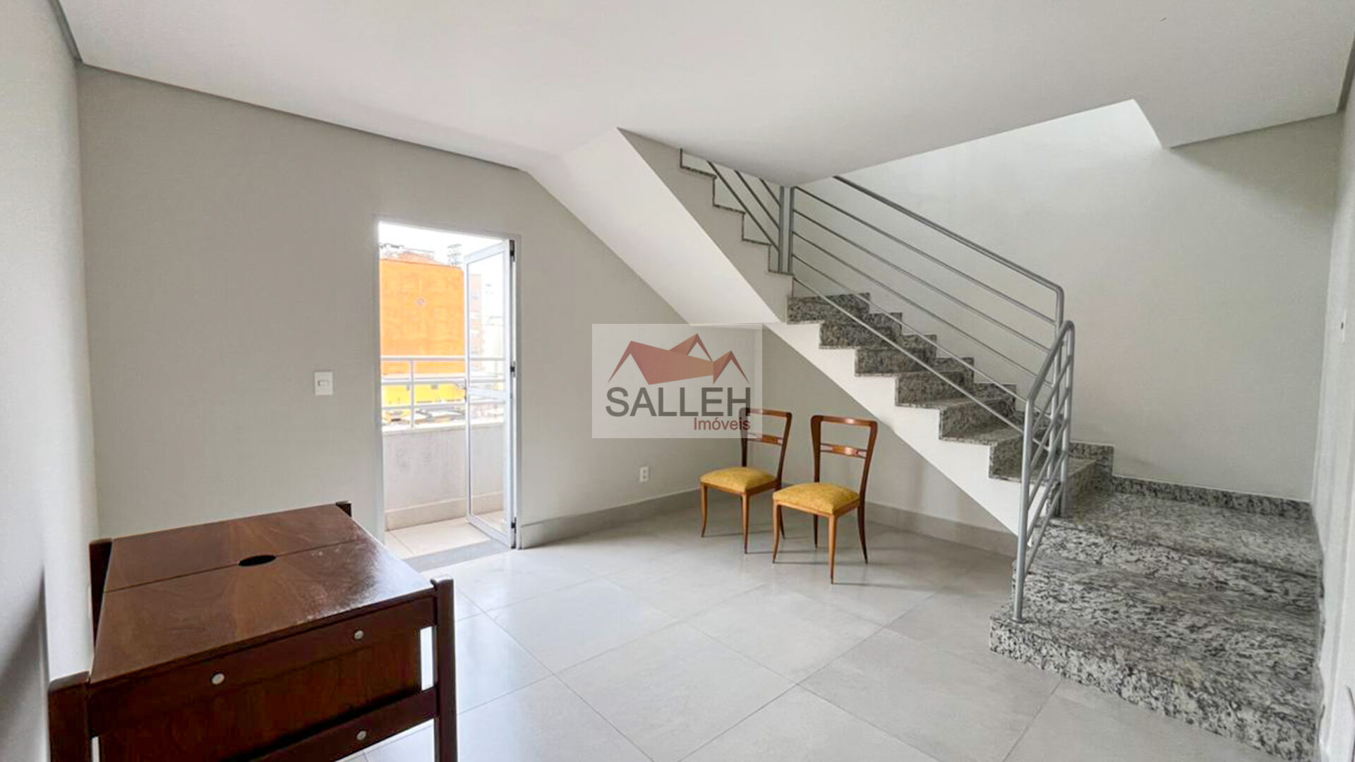 1° Pavimento: Sala confortável e bem iluminada, com piso em porcelanato e varanda integrada, proporcionando amplitude e excelente ventilação natural.