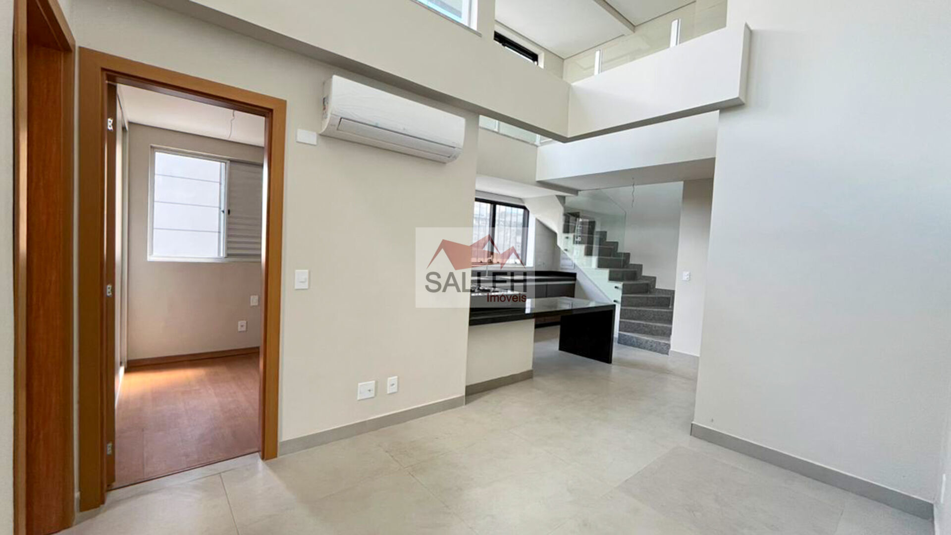 1° Pavimento: Sala ampla com pé-direito duplo, excelente luminosidade natural, ar-condicionado e piso em porcelanato, cozinha americana com ilha central, cooktop, armários planejados e bancadas em granito e 02 suítes confortáveis, ambas com armários planejados, ar-condicionado e piso em laminado de madeira.