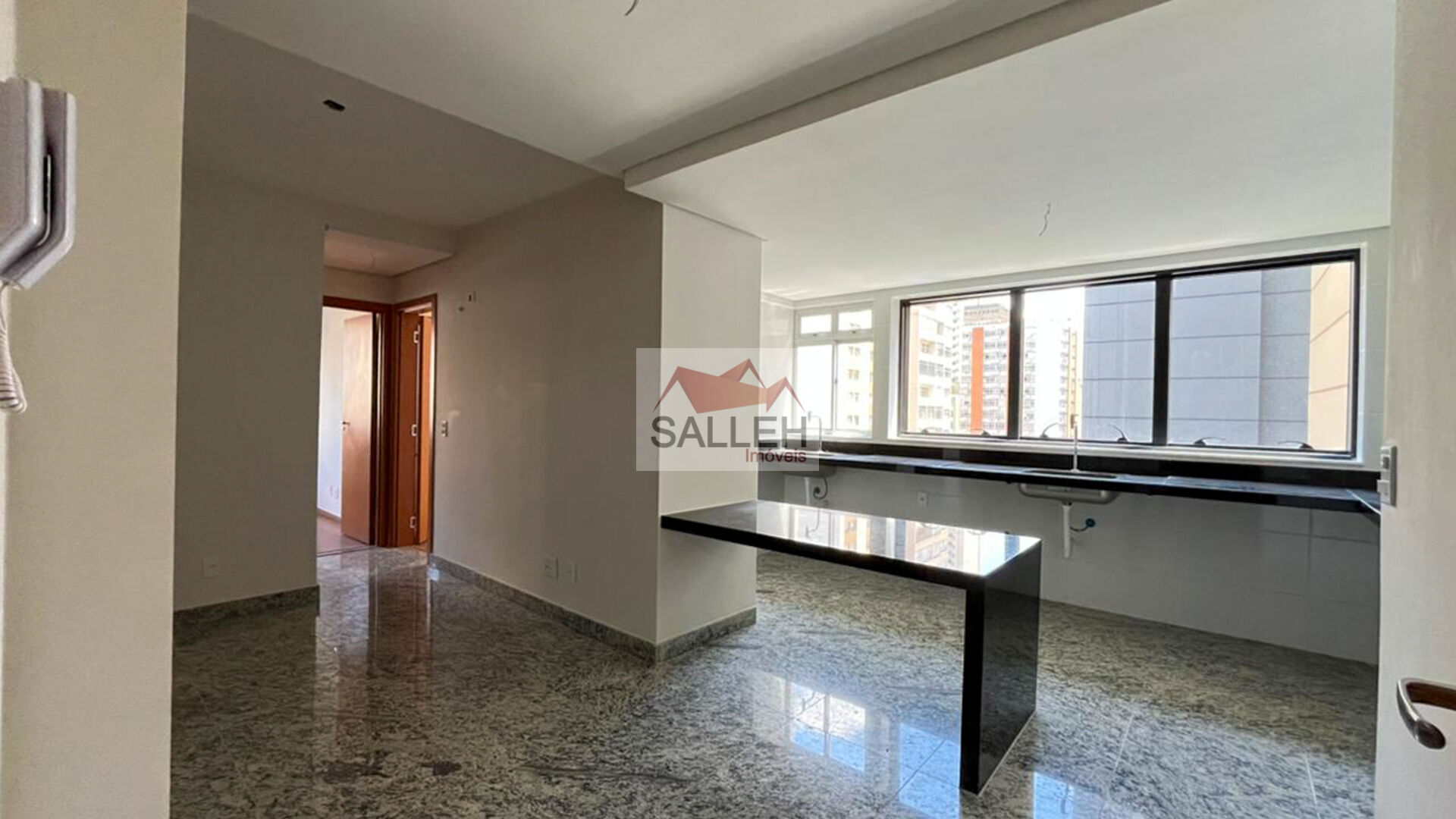 Sala de estar e jantar integradas, com piso em granito e ótima iluminação natural, cozinha americana com bancadas em granito e piso também em granito, integrada à sala e projetada para otimizar o espaço, 02 quartos com piso em laminado de madeira, sendo 01 suíte confortável, banheiros (social e suíte) com acabamento de excelente qualidade e área de serviço funcional.