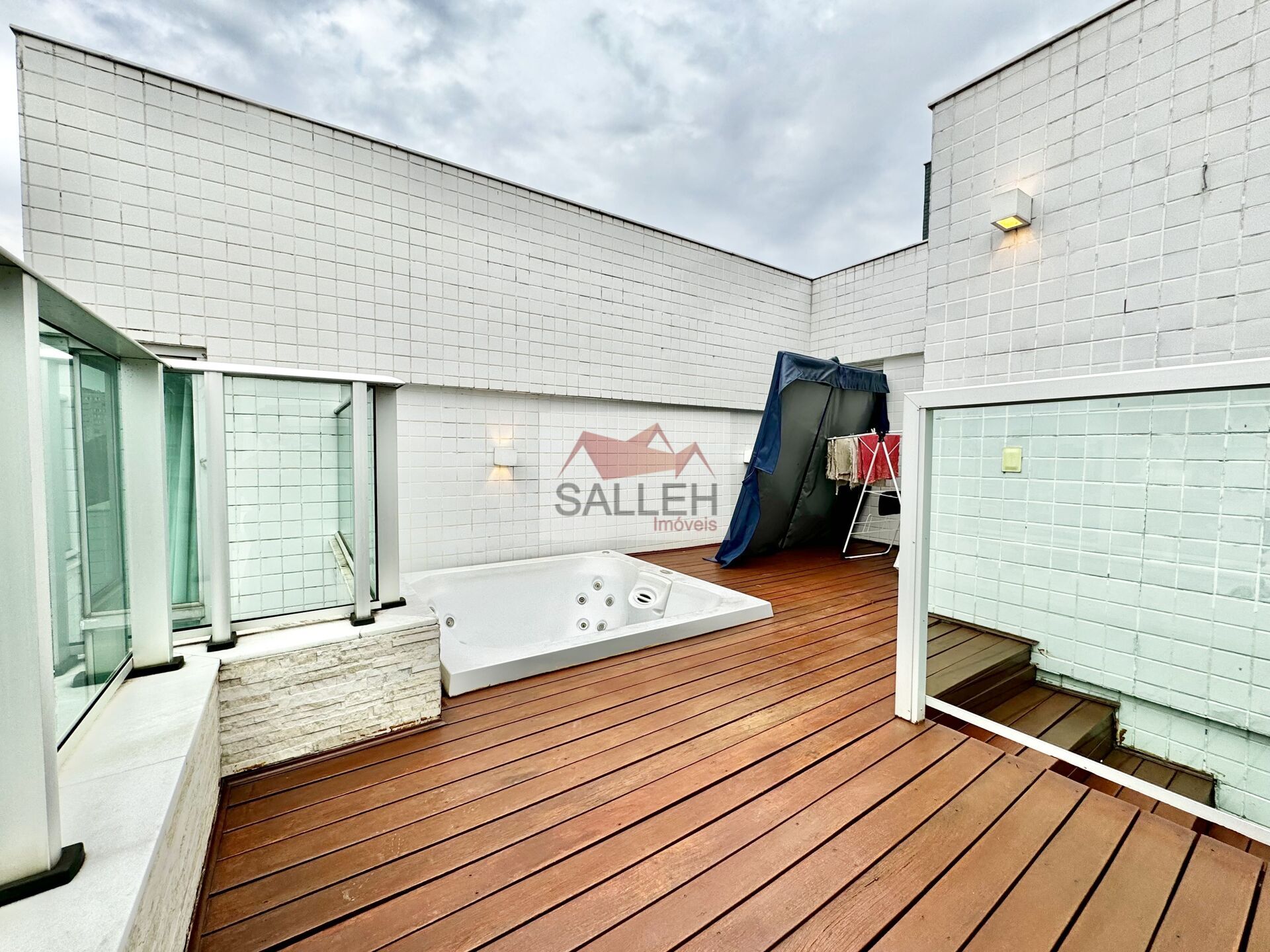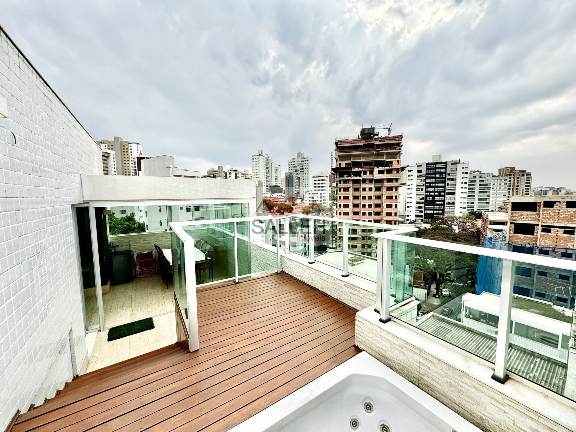 2º piso sendo excelente sala decorada e montada com piso em porcelanato e rebaixamento em gesso, lavano montado, excelente terraço com maravilhoso espaço gourmet montado com armários e churrasqueira, coberto e fechado em blindex, no lado externo um deck com uma jacuzzi, ducha e uma linda vista definitiva.