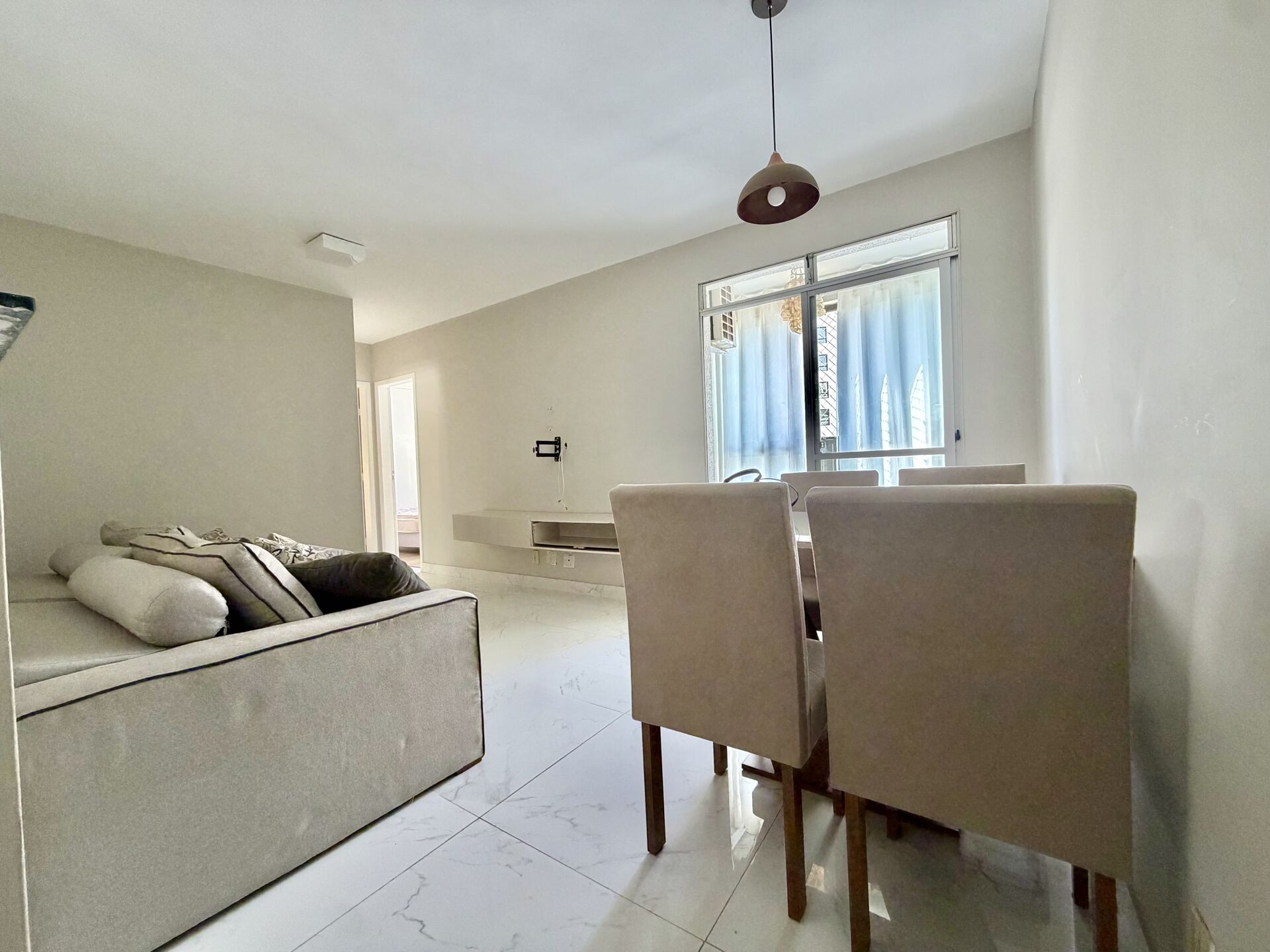 Sala ampla para dois ambientes, com o piso em porcelanato com mesa de 04 lugares, um sofá de 02 lugares, painel fixo na parede com rack, piso em porcelanato, varanda, cozinha americana com armários planejados, fogão, área de serviço, banheiro social com box e armário, 02 quartos com armários, sendo 01 suíte com armário, quarto de solteiro com bancada de escritório, quarto de casal com cama de casal e ar condicionado.