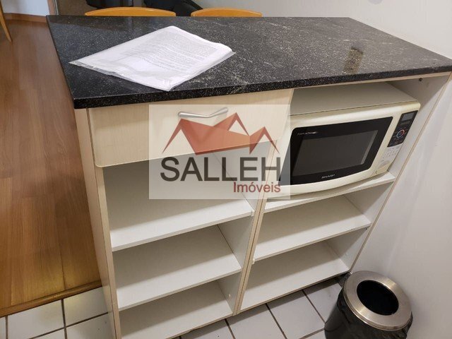 Sala ampla com piso laminado, para 02 ambientes ou podendo dividir para dazer um segundo quarto, cozinha integrada, com armários, micro-ondas, frigobar, 01 quarto sendo suíte ampla com cama de casal, armários, banho com box blindex e espelho.
