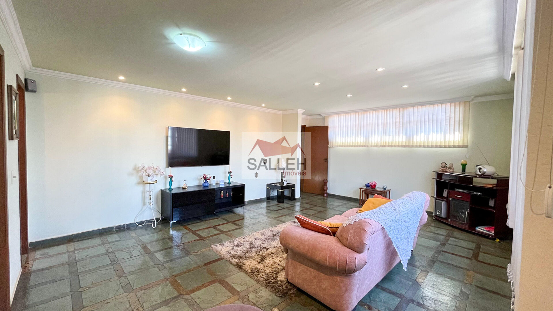 1 Sala para dois ambientes com piso em ardósia/tábua corrida e iluminação planejada, 01 quarto com piso em ardósia e banheiro social com bancada e espelho.