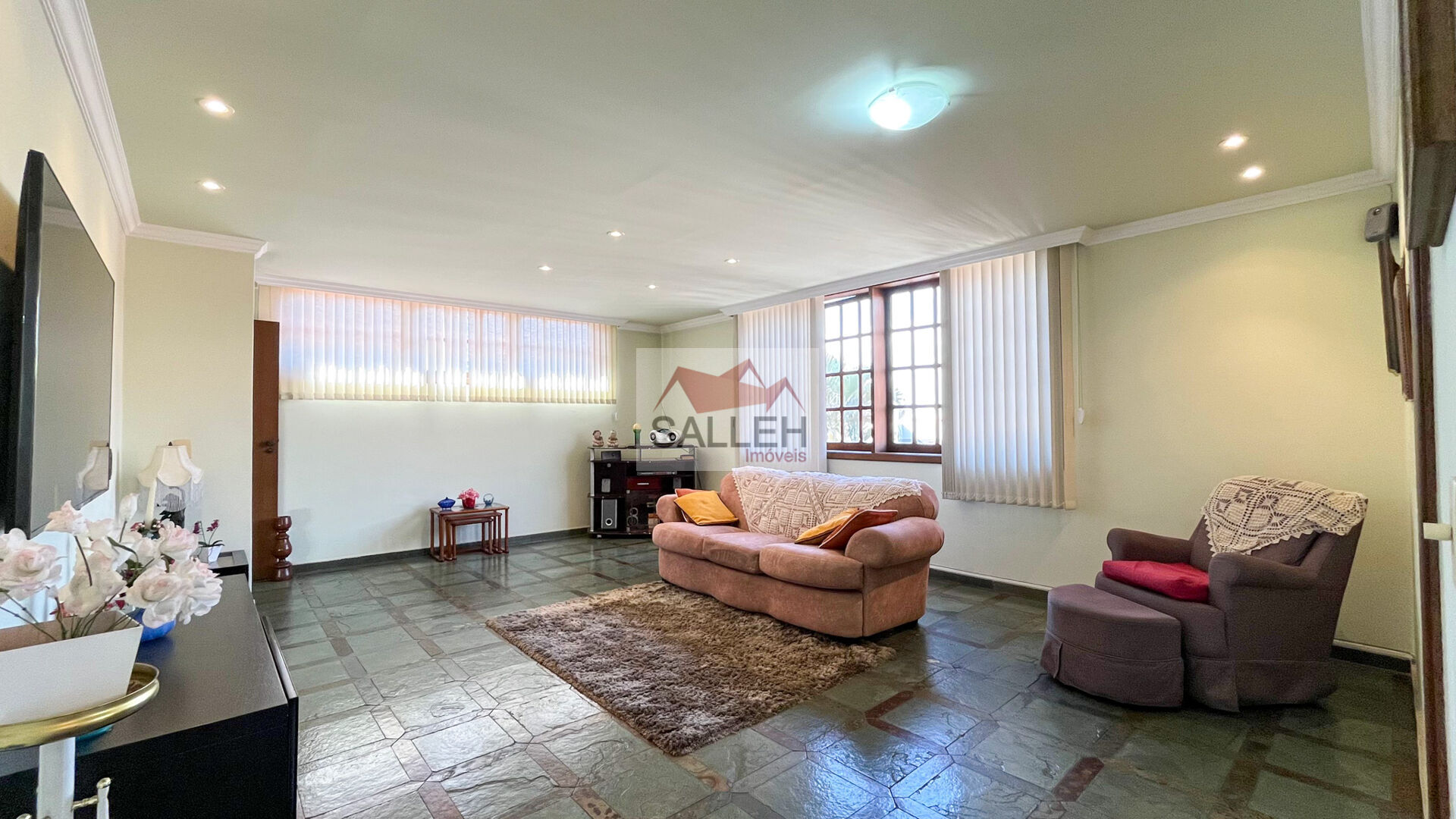 03 salas amplas, duas com teto rebaixado, iluminação planejada, com piso em tábua corrida e outra com piso em ardósia, conjugada com uma varanda, área externa com churrasqueira, excelente para criar uma varanda gourmet, 03 quartos amplos com piso em tábua corrida, armários, sendo uma suíte com espelho, armários, banheira, bidê e box em blindex, cozinha espaçosa com bancada em granito, piso em cerâmica e armários planejados. Um quarto com suíte, que pode ser convertido para quarto de hóspedes que fica na parte externa do imóvel, despensa, banheiro social com bancada em granito, espelho, box em blindex, área de serviço ampla com dois tanques e DCE.