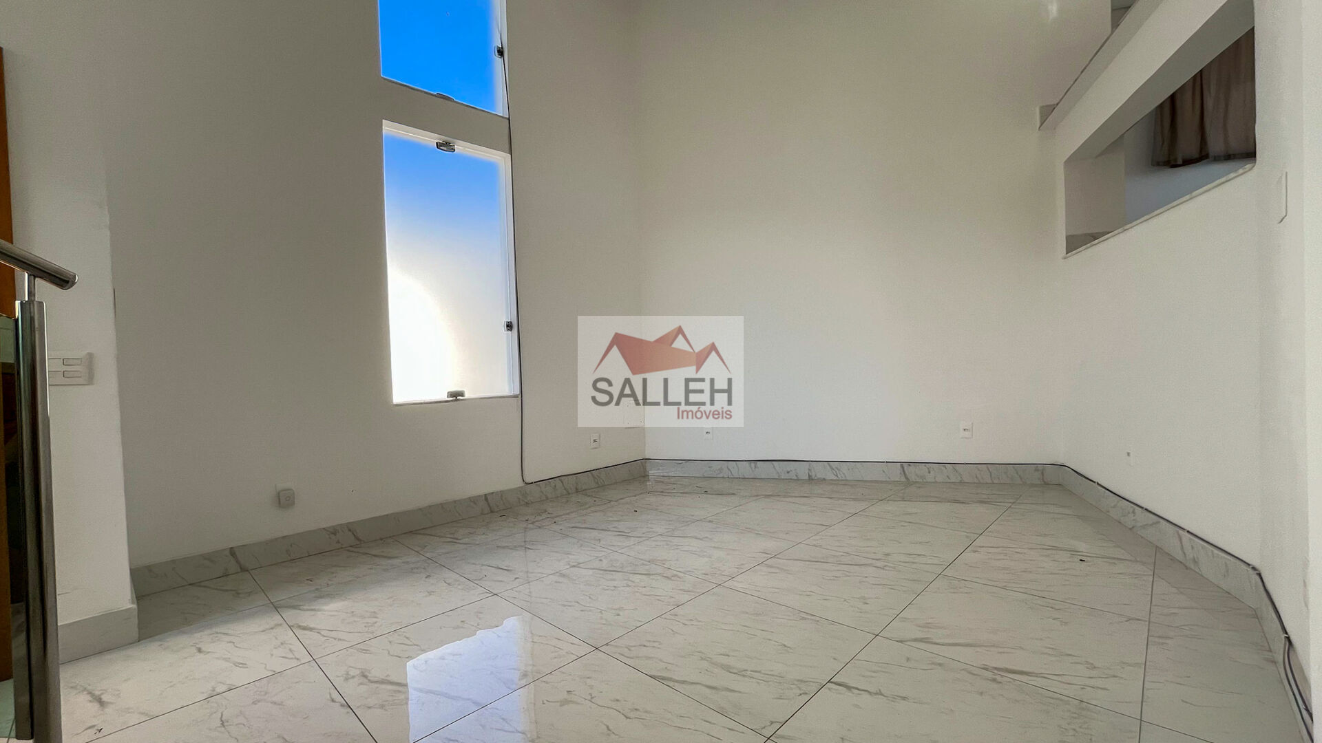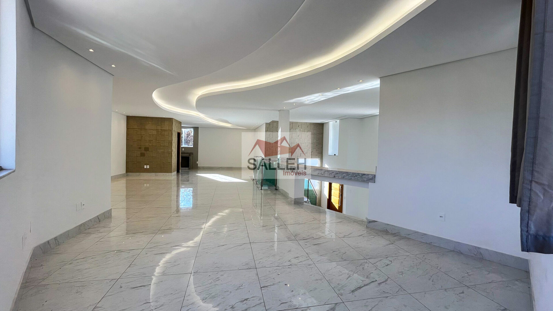 1º Pavimento (nível da rua): Sala ampla com acabamento de alto padrão, pé-direito duplo, piso em porcelanato, rebaixamento em gesso e iluminação planejada, cozinha de apoio em conceito aberto, equipada com bancadas em granito e lavabo com acabamento refinado.